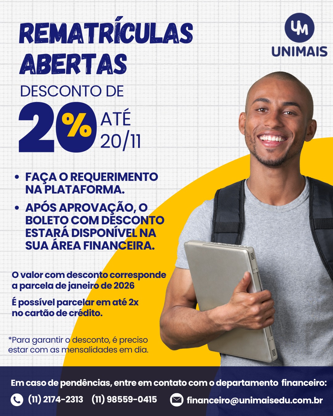Para eventuais esclarecimentos e envio dos comprovantes, favor nos contatar via e-mail financeiro@unimaisedu.com.br.